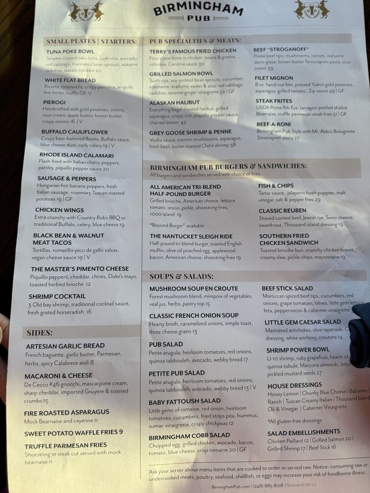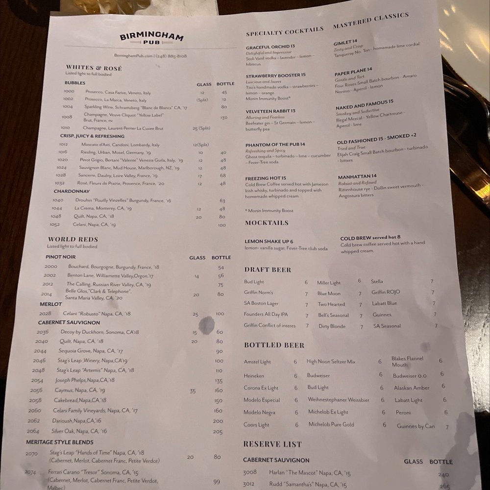 The Birmingham Pub, located in Birmingham, MI, offers a unique gastropub experience with a focus on New American cuisine. This classy yet casual establishment not only provides street parking but also allows dogs, making it a great option for all kinds of diners. The menu boasts a variety of rye whiskies, beverages ranging from apple juice to Red Bull, and a selection of whiskeys. With options like Angels Envy Rye and Crown Royal, patrons can indulge in high-quality spirits. The Birmingham Pub also offers delivery and takeout services, along with a happy hour special for those looking to unwind after a long day. Whether you're a whiskey enthusiast or just looking for a good meal, Birmingham Pub has something for everyone.